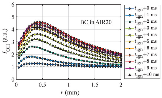 - The first approach identifies ignition based on radial profiles of the OH-LIF intensity (). Figure 2 shows an example for a BC particle at various time steps post-ignition. When a particle intersects with the laser sheet, it appears as a dark stripe, which is excluded from the orientation-averaged intensity calculations. As shown in prior 3D studies [41], increases toward the reaction zone and decreases in the post-flame region. Ignition is defined as the moment when surpasses the normalized background level (unity), attributed to the formation of OH via the dissociation of water in hot gas environments. A rapid rise in is observed within a few milliseconds, followed by a plateau and an eventual decline after 7–8 ms. This behavior reflects the continuous release and consumption of volatiles in a diffusion-controlled, non-premixed flame, where the oxidizer and the fuel meet from opposite directions. The temporal evolution of the radial intensity profile further enables quantification of the flame stand-off distance and the location of the reaction zone, as discussed in Section 3.4.