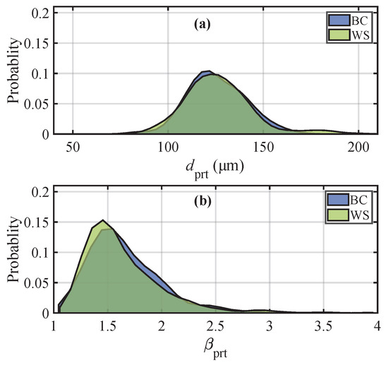 PDFd of the particle diameter () (a) and aspect ratio () (b) of the investigated particles.