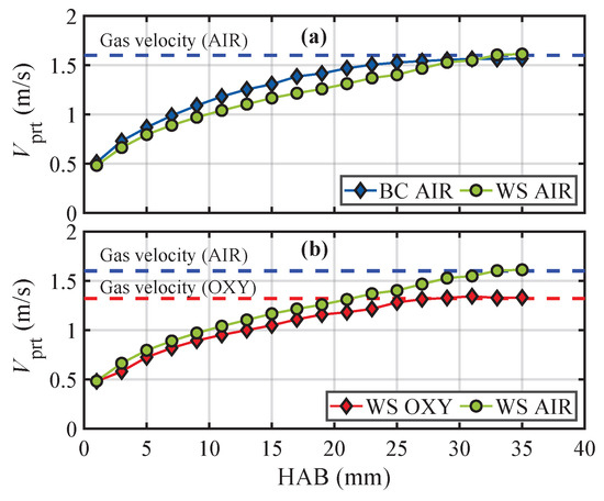 Figure 4 shows the averaged particle velocity profiles at various HABs, with the corresponding gas velocities indicated by dashed lines. The experimental conditions are designed to maintain comparable gas velocities across cases. Specifically, the gas velocity for AIR10–40 conditions is approximately 1.67 m/s, which is higher than the 1.35 m/s measured under OXY20–40 conditions [19]. The gas velocities are shown in dashed lines in Figure 4. Entering the burner, both BC and WS particles accelerate toward the gas’s velocity, generally following an exponential trajectory which agrees well with the previous calculation using Stokes’ drag law [38].