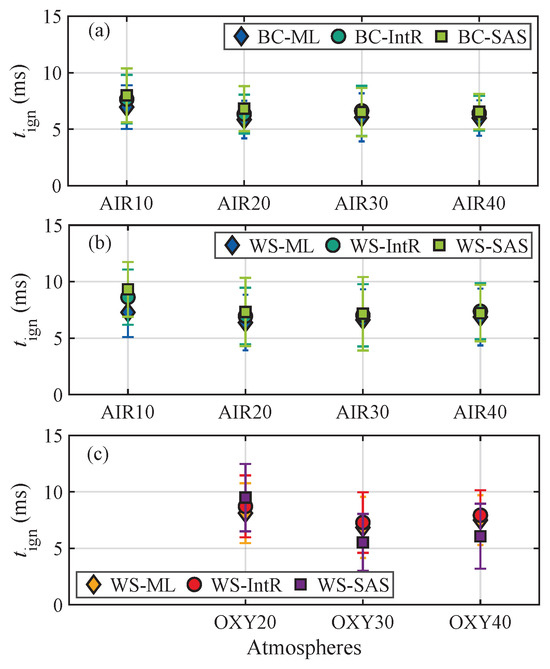 As explained in Section 2.3, the ignition delay times are determined using three distinct methods: a structure and signal analysis (SAS), a radial intensity analysis (IntR), and a machine-learning-based method (ResNet) previously developed in [20]. Figure 5 presents a comparison of the values for BC and WS particles under various reactor conditions. Overall, the three methods yield consistent ignition delay times, with the discrepancies between the mean (represented by symbols) remaining within the respective standard deviations (represented by error bars). A minor deviation is observed in the SAS results under OXY conditions, likely due to the threshold values being optimized for the signal characteristics in AIR environments. Both the ResNet and IntR methods demonstrate a robust performance with a high computational efficiency. Notably, the ResNet model was trained on another dataset from previous measurements in [20], and its successful application here without parameter tuning illustrates its capability to generalize to similar datasets.