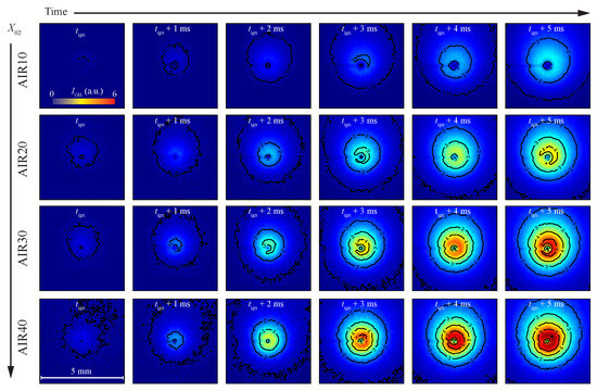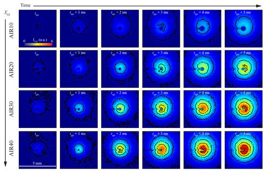 As exemplified in Figure 2, the gas-phase reactions start with ignition and proceed with increasing OH-LIF intensities, peaking around 7 ms in AIR20 before gradually declining. The planar OH-LIF images were time-aligned with the ignition point and subsequently averaged across multiple single-particle events. Typically, more than 100 particles were used for averaging in every condition. Figure 6 and Figure 7 depict the temporal evolution of the planar OH-LIF signals in AIR environments for BC and WS particles, respectively, across increasing oxygen mole fractions . These sequences confirm the two-dimensional development of the flame dynamics observed earlier in Figure 2. The reaction zone forms a nearly spherical envelope around the particle, with slight downstream elongation due to the slip velocity between the gas and the particle. Obstruction of the laser beam by the particle generates a shadowed region on the left side (the laser direction from right to left).