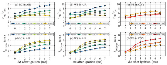 To investigate the temporal evolution of the flame structures further, the flame stand-off distance was evaluated by identifying the location of peak reactivity—defined as the position of the maximum OH-LIF intensity ()—and normalizing it by the particle radius, yielding . The results are presented in Figure 9a–c. Beginning from the ignition point ( ms), the stand-off distance increases progressively during the early phase of volatile combustion, indicating that the peak reaction zone moves outward from the particles’ surface. At higher oxygen mole fractions, however, the volatile flame stabilizes closer to the particles, which can be attributed to the enhanced oxygen diffusion facilitated by elevated far-field .