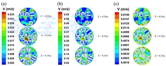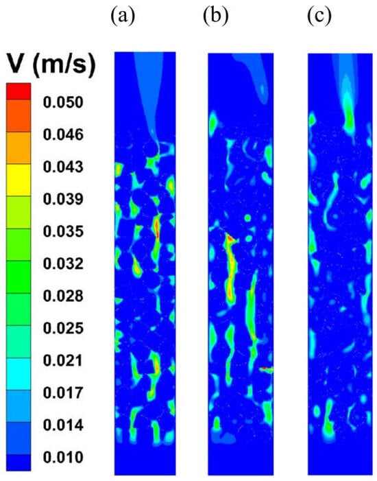 Velocity distribution under different catalyst shapes. ((a) Solid cylinder; (b) hollow cylinder with hollow 12.98 mm; (c) hollow cylinder with hollow 15.80 mm).