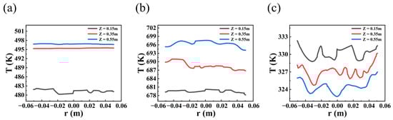Radial temperature profiles of methanol to dimethyl ether system at different locations in the reactor: (a) methanol to dimethyl ether system; (b) synthetic methanol system; (c) levulinic acid esterification reaction system.
