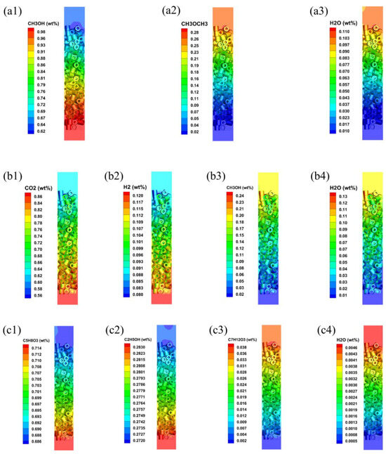 Mass fraction distributions of reactants and products in different systems: (a) methanol to dimethyl ether system; (b) synthetic methanol system; (c) levulinic acid esterification reaction system. ((a1–a3): mass fraction of CH3OH, CH3OCH3 and H2O; (b1–b4): mass fraction of CO2, H2, CH3OH and H2O; (c1–c4): mass fraction of C5H8O3, C2H5OH, C7H12O3 and H2O).