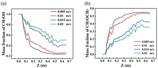 Axial mass fraction distribution of methanol and dimethyl ether at different feed velocities. ((a) mass fraction of CH3OH; (b) mass fraction of CH3OCH3).