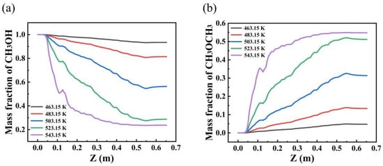 Axial mass fraction distribution of methanol and dimethyl ether at different feed temperatures. ((a) mass fraction of CH3OH; (b) mass fraction of CH3OCH3).