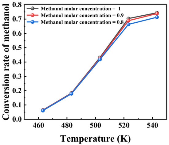 The simulation results in Figure 8 show that the molar concentration of the feed methanol has almost no effect on the system’s conversion, while temperature has a more significant impact. Specifically, the methanol conversion changes very little whether the molar concentration of methanol is 0.8, 0.9, or 1. This suggests that within a certain range, the molar concentration has a minor effect on the methanol conversion. However, temperature has a significant impact on methanol conversion.