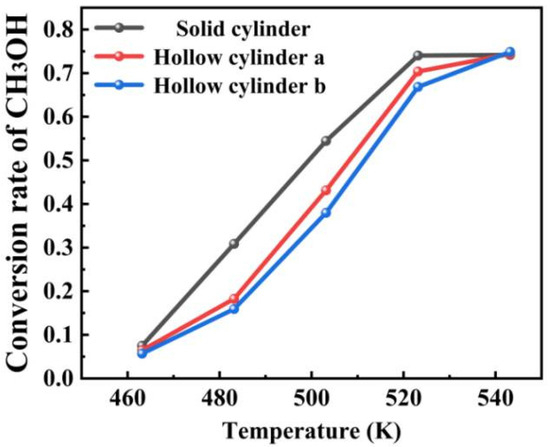 The effect of these catalyst shapes on the reaction performance of the methanol-to-DME system was further evaluated and analyzed at five different temperatures, as previously described. At the lower temperature of 463.15 K, the conversions for the three catalyst shapes were 7.50% for the solid cylindrical structure, 6.46% for hollow cylinder a, and 5.69% for hollow cylinder b. This indicates that the volume of the hollow core in the catalyst particles has a minimal effect on the conversion at this temperature. However, at intermediate temperatures (483.15 K, 503.15 K, and 523.15 K), Figure 11 and Table 4 shows that the effect of catalyst shape on the conversion becomes more significant. At these temperatures, the highest conversion was achieved with the solid cylindrical catalyst. By 543.15 K, the conversion was nearly the same for all three catalyst shapes. Thus, the solid cylinder particles provided the highest conversion in the temperature range from 483.15 K to 523.15 K, while at other temperatures, the catalyst shape had less impact on the conversion. After the conversion rate reaches 75%, the conversion does not increase beyond 0.75 even if the temperature is further increased. This is because as the temperature increases, the equilibrium conversion rate further decreases because the equilibrium constant decreases with increasing temperature. Due to the characteristics of exothermic reactions, this expected behavior occurs. Meanwhile, an increase in water content in the feed will reduce the achievable methanol equilibrium conversion rate, as it favors reversible reactions (DME+H2O → 2MeOH). That is to say, temperature and water content have a significant impact on the equilibrium conversion rate of methanol dehydration reactions, especially under high-temperature and high-water content conditions, in which the equilibrium conversion rate will significantly decrease [36].