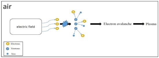 Plasma is the fourth state of matter, which can be regarded as an ionized gas where positive and negative ions and electrons can move freely, exhibiting conductivity, unlike neutral gases, which do not conduct electricity. Plasma generation can occur by applying an external electric field; when the electric field strength is sufficiently high to cause an electron avalanche, plasma can be produced [11]. The process of dielectric plasma discharge is illustrated in Figure 1. The plasma contains positive and negative ions, electrons, and neutral gas molecules, and it also possesses various free radicals or excited particles [12]. The presence of these diverse and multi-characteristic particles is precisely why plasma can be widely applied in different fields. For example, high-energy electrons in plasma can excite numerous chemical reactions through collisions with other particles; ion bombardment is applied in semiconductor processes, free radicals can be used for material surface treatment, and excited molecules are utilized for illumination applications. If classified by temperature, plasma can be divided into low-temperature plasma (LTP) and high-temperature plasma (HTP) [13]. Among them, according to the energy balance state between particles, low-temperature plasma is further divided into thermal equilibrium plasma and non-thermal equilibrium plasma [14], with ion temperatures less than 2.0 × 104 K and greater than 1.0 × 107 K, respectively [15].
