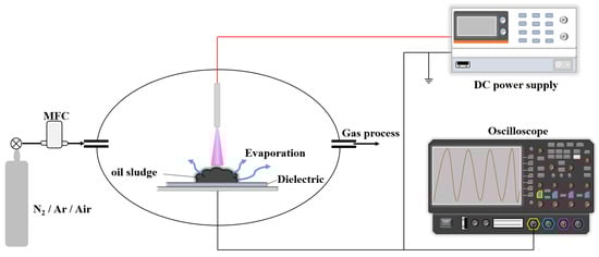 This study used two types of non-thermal plasma: DC streamer discharge and dielectric barrier discharge (referred to as DBD). The former generates streamer discharge or a plasma arc based on the voltage level, while the latter produces silk-like discharge. Plasma will be generated in the gap between the quartz plate and the surface of the oily sludge to treat the sludge. The appearance changes before and after treatment were recorded using a camera. The methods for analyzing the compositions and properties of the fuel oil are described as follows: An elemental analyzer (CHN-OS Rapid Element Analyzer, Heraeus Ltd., Hanau, Germany) was used to analyze the elemental C/H/O/N contents of the refined fuel oil produced from the oily sludge through the plasma action. The weight ratio of the carbon particle left after the burning process to the original weight of the fuel oil in a crucible was calculated and recorded as the carbon residue of the fuel. The heating value of the refined fuel oil was measured by an automatic insulated oxygen-bomb calorimeter (model 1261, Parr Instrument Corp., Moline, IL, USA) according to the temperature rise of tank water after the fuel was burned in the calorimeter and released heat to the tank water. A higher heating value associated with a lower carbon residue is preferrable as it indicates a superior fuel combustion efficiency and a higher amount of heat release [28].