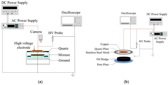 Experimental setup of DBD plasma reactor for treating oily sludge: (a) indirect treatment, and (b) direct treatment.