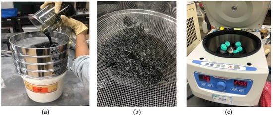 The oily sludge was sequentially poured into filters with various mesh sizes, of 10 mesh, 50 mesh, 100 mesh, and 200 mesh, to initially filter out larger solid impurities, as shown in Figure 4a. Figure 4b shows the impurities remaining on the filter mesh after filtration, clearly indicating that the particle sizes of the impurities were large and could not be reused, necessitating further treatment. A centrifuge was used to separate oil products by gravity difference, with impurities settling at the bottom, heavy oil in the middle, and light oil at the top.