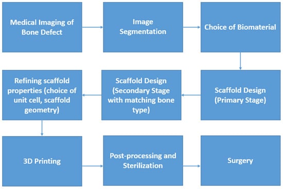 Additive manufacturing (AM) or 3D printing (3DP) technology is a revolutionary and efficacious alternative to conventional manufacturing techniques. 3DP covers a wide range of applications, such as aerospace, biomedical, electronics and digital control, food, biotechnology, etc. The core advantages of 3DP include the minimization of material wastage, freeform fabrication, fabrication of complex shapes such as lattices, and enhanced productivity due to reduction in various production steps [1,2]. 3DP has been currently used in the manufacture of medical devices, especially bone scaffolds, implants and assistive/rehabilitation devices. The process of 3DP customized bone scaffolds has been illustrated in Figure 1. Although human bones could regenerate and self-repair, this is limited and dependent on the extent of the injury, site of bone defect, age, gender, and other factors [3,4,5,6,7]. Bone damage exceeding its acceptable limit may lead to the loss of self-healing, thereby calling for artificial repair by means of bone replacement [8,9,10,11]. Bone scaffolds are capable of functional and structural repair and the regeneration of bone defects. There have been extensive research advancements in the field of orthopedic scaffolds, however, repair/treatment of bone defects is one of the key challenges in the realm of orthopedics and regenerative medicine [11]. Bone defects could be caused due to tumor, trauma, or malunion during fracture healing, and should be treated using surgical intervention and therapeutic treatment; surgical intervention involves the use of permanent or temporary bone scaffolds [11,12]. Tissue lesions resulting from accidents, trauma, tumors, infection, congenital defects, ageing, etc., will need artificial scaffolds or transplantation for recovery. The potential of customized scaffold manufacture using 3DP has opened new horizons in the biomimetic metallic scaffold realm and reconstruction of complex bony defects [13].