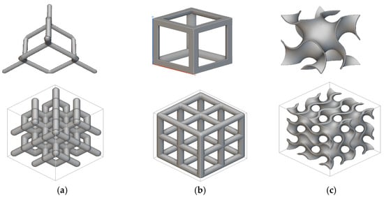 Cylindrical (⌀ 10 mm × h 20 mm) and disc (⌀ 10 mm × h 4 mm) samples were designed for the mechanical and biological tests, respectively. The cylindrical samples were designed as per the ASTM E9 standard (Compression Testing of Metallic Materials at Room Temperature) [31], which also satisfies the ISO 13314: 2011 standard [32] for compression testing of porous metal samples. The porous scaffolds were designed using nTopology version 3.29.3. Three different unit cells (diamond, cube, and TPMS gyroid) (Figure 3) with three different pore sizes (300, 600, and 900 μm) were designed.