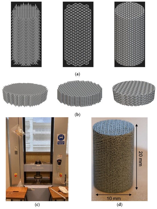 (a) CAD models of cylinder samples (ϕ 10 mm × h 20 mm). (b) CAD models of disc samples (ϕ 10 mm × h 4 mm). (c) Mechanical testing setup. (d) Specimen geometry (gyroid sample).