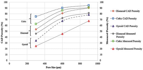 Figure 5 depicts the CAD and measured porosity of the 3DP scaffolds.