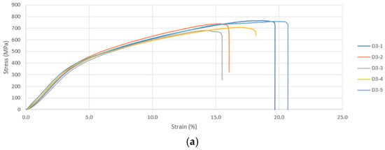 During compression testing of D300 samples, shear occurred in all five samples. The D300 (porosity < 50%) and D600 (porosity > 50%) were suitable for cortical bone applications. Unlike the former, the latter is not suitable for high-load-bearing applications such as in the diaphysis region or distal region of the femur. The D900 (with porosity > 50%) sample is closer to the range of the trabecular bone’s modulus and can be considered for non-load bearing scaffolds. This asserts the importance of pore size in reducing the elastic modulus mismatch and stress-shielding for bone scaffolds. Similar trends were also noted for the UCS and σy. A bone scaffold biomaterial should have high yield strength and fatigue strength to prevent failure under cyclic loading; hence apposite yield strength is necessary. The representative stress–strain curves from the compression testing are given in Figure 6a–c. The images of failure modes of all the samples are given in the Supplemental File (Section S2).