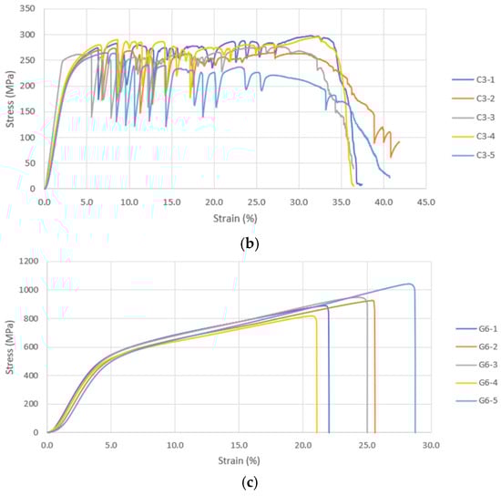 (a) Compressive Stress–Strain Curves for Diamond 300 Scaffold. (b) Compressive Stress–Strain Curves for Cubic 300 Scaffold. (c) Compressive Stress–Strain Curves for Gyroid 600 Scaffold.