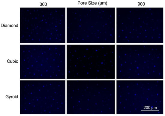 A smaller pore size provides larger surface area for cells to interact, thereby producing more interfacial force prior to falling through the pores. Hence, smaller pore sizes are expected to have more surface attachment of cells. This could be reason for more cells to be found on the surface of D300, C300, and G300. The diamond group had maximum cell adherence in the 300 and 600 group whereas the C900 reported superior adherence in the 900 μm group. It has to be noted that cell adhesion is the first cellular event when osteoblasts contact a scaffold surface. According to Xu et al. (2016) [69], cell adhesion impacts the proliferation, tissue formation, and differentiation. As reported by Van Bael et al. (2012) [70], cell seeding efficiency indicative of cell adherence (on day 1) was significantly higher in the smallest pore size.