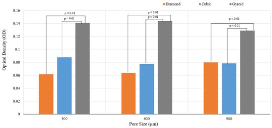 A statistically significant difference in the cell proliferation was reported between the diamond/gyroid and cubic/gyroid groups. Cell proliferation in both the strut-based lattices did not show any statistically significant difference; however, the sheet-based TPMS gyroid had substantially higher cell proliferation. The higher cell proliferation on G600 could be due to a balance between the pore size and surface adherence. It has to be noted that the actual pore sizes of the G600 and G900 samples are 423 ± 12.5 μm and 710 ± 6.8 μm, respectively. The TPMS gyroid structures are characterized by high permeability in addition to a slick and uniform surface. It is known for its absence of sharp corners, high surface area, and highly interconnected network and zero mean curvatures. It has to be noted that the mean surface curvature of the cancellous bone is close to zero; this promotes cell proliferation and tissue regeneration on such scaffolds. This could be one of the key reasons for the increased cell proliferation on the gyroid scaffolds.