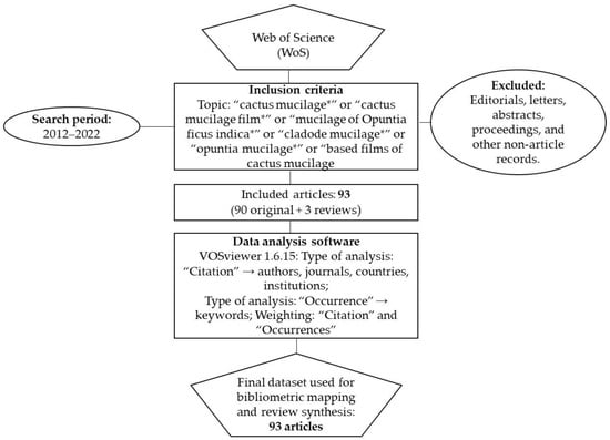The bibliometric analysis began with a search on the Web of Science (WoS) data platform (www.webofknowledge.com) to analyze global scientific production regarding biodegradable cactus mucilage films in the last 10 years (2012–2022). In this study, we used the search terms “cactus mucilage*” or “cactus mucilage film*” or “cactus mucilage*” or “mucilage of Opuntia ficus indica*” or “mucilage extraction from Opuntia ficus indica*” or “cladode mucilage*” or “opuntia mucilage*” or “based films of cactus mucilage*” or “cactus mucilage extraction*” or “mucilage polymer*” to filter the search in the database (WoS). For the search, the topic criterion was used, thus ensuring the broadest return of works that presented the search expressions in the title, abstract, keywords, and Keywords Plus. Subsequently, the results were refined into “articles” and “reviews”, obtaining a total of 90 scientific articles and 3 reviews. The methodological procedure adopted to conduct the bibliometric analysis is summarized in Figure 1.