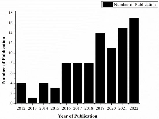 Then, the data obtained from WoS were analyzed using the program VOSviewer, version 1.6.15 (www.vosviewer.com, accessed on 10 January 2023) [20,21], to create bibliometric graphic mapping and network visualization, in which “citation” was used as a type of analysis to obtain the most cited authors, publications, periodicals, institutions and countries and “occurrence” was used to obtain the keywords with the highest occurrence in the analyzed period, both without taking into account the weight and strength of the link for the ranking of results in the program. After obtaining the graphs, the weight “citation” was used for the results obtained from this type of analysis and “occurrences” was used for the keywords. Furthermore, the OriginPro version 8 program (www.originlab.com, accessed on 25 January 2023) was used to visualize the analyzed data and draw a global graph showing the distribution of articles by year.