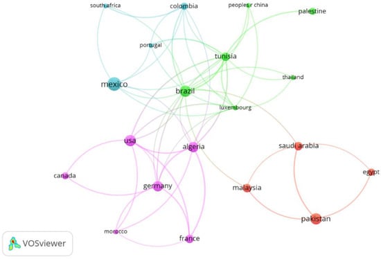 Visualization map of the 20 most cited countries in cactus mucilage research and its application in biodegradable films based on bibliometric analysis from the Web of Science database (2012–2022). The map is divided into four distinct clusters, with Cluster 1 (pink) and Cluster 2 (green) including the largest number of countries (six each), featuring nations such as the United States and Tunisia, respectively—both with the highest citation rates. Cluster 3 (blue) and Cluster 4 (red) include countries with lower citation frequencies, such as Mexico, South Africa, Palestine, and Egypt. The color-coded clusters represent collaboration patterns among countries based on co-authorship networks.