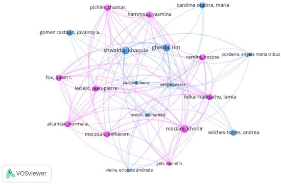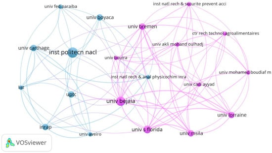 Collaborative network of the 20 most cited institutions in cactus mucilage research and its application in biodegradable films according to a bibliometric analysis conducted in the Web of Science database (2012–2022). Note: VOSviewer was used. Institutions: Federal University of Paraiba (Brazil); National Institute of Research and Physico-chemical Analysis (Tunisia); University of South Florida (United States); Luxembourg Institute of Science Technology (Luxembourg); Aveiro University (Portugal); INRAP—National Institute for Preventive Archaeological Research (France); National Institute of Research and Safety for the Prevention of Work Accidents (France); Polytechnical Institute National Mexico (Mexico); University of Boyacá (Colombia); University of Béjaïa (Algeria); University of Bremen (Germany); University of Lorraine (France); Carthage University (Tunisia); Pedagogical and Technological University of Colombia (Colombia); University of Bouira (Algeria); University of M’sila (Algeria); Université Akli Mohand Oulhadj (Algeria); Cadi Ayyad University (Morocco); Centre de Recherche en Technologies Agro-Alimentaires (Algeria); University Mohamed Boudiaf (Algeria).