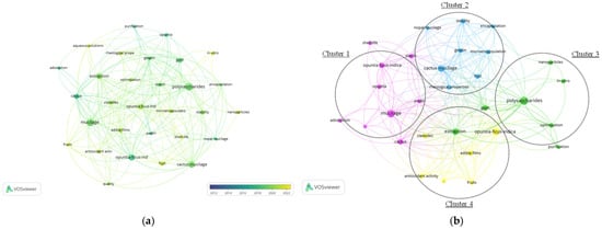 The 30 most frequently occurring keywords in cactus mucilage research and their application in the development of biodegradable films based on a bibliometric analysis of the Web of Science database (2012–2022): (a) overlay visualization; (b) network visualization.