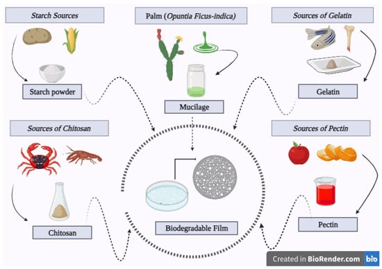 An alternative to minimizing these environmental impacts is the use of natural biopolymers in the development of biodegradable films. Biopolymers are obtained from renewable sources of animal and plant origin, including proteins such as collagen, chitosan, gelatin, and polysaccharides such as starch, pectin, and cellulose, among others [2,3,4]. These natural polymers have been gaining ground in scientific circles, mainly in the biodegradable and flexible packaging segment, presenting potential for application in food. Another important factor is that the life cycle of renewable sources is shorter, contributing positively to environmental sustainability [5,6].