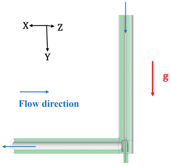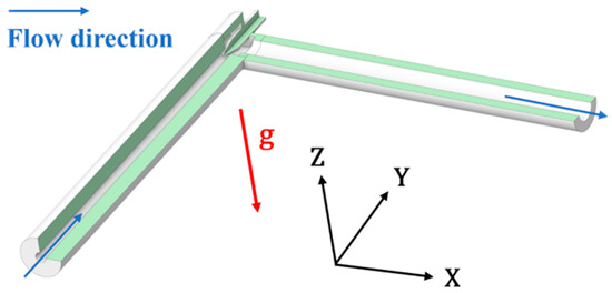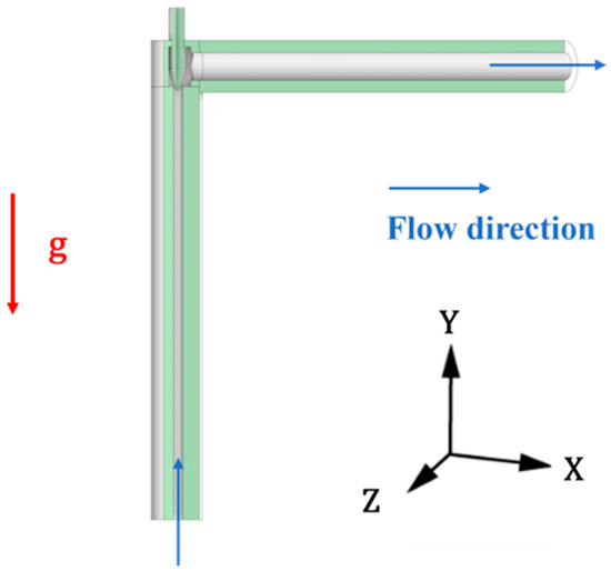 As shown in Figure 3, in the NTV inverted placement model, the direction of gravity coincides with the flow direction when the gas–solid two-phase flow enters the upstream pipeline. When the gas–solid flow enters the downstream, the flow direction is perpendicular to the direction of gravity, which is the same as vertical placement.