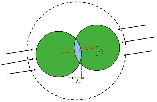 where is the normal overlap (as shown in Figure 4), and and are the equivalent Young’s modulus and radius, respectively.