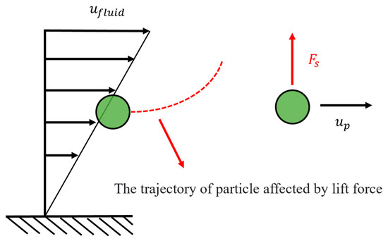 When a particle is in a flow field with a velocity gradient, it is subject to lateral lift even if the particle does not rotate itself, and the trajectory of the particle changes under the influence of this force, as shown in Figure 5. Since the velocity gradient near the wall is often large, and the problem studied in this paper is mainly the erosion of the wall, this force is also considered in the external force. The expression for the Saffman lift is shown in Equation (18).