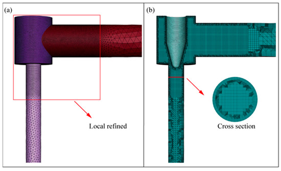 In this paper, the finite volume method is used to solve the fluid computational domain, which is divided into meshes of different volumes. The finite volume method solves conserved quantities in integral form by discretizing the governing equations, and the results are directly influenced by meshing. In complex geometric structures such as NTV, rough or poorly aligned meshes can lead to significant numerical diffusion and truncation errors, resulting in inaccurate prediction of sharp gradients in velocity and pressure fields. The finer the mesh, the smaller the discrete error, but the more the computational resources are required [38]. Mesh independence validation is the bridge between ‘numerical discretization’ and ‘physical reality’. It strikes a balance between computational accuracy and computational efficiency by comparing solutions from multiple sets of grids and confirming whether the results converge to a continuous solution. Due to the very drastic changes in the flow field in the throttle channel as well as in the valve chamber, we locally refine the mesh in this region. Figure 6 is the schematic diagram of the meshing of NTV.