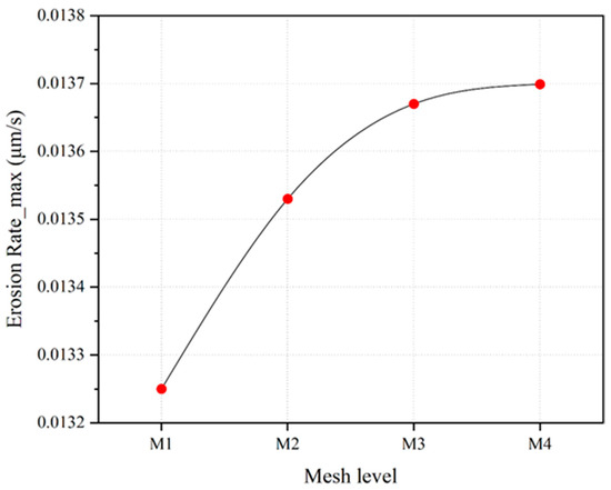Figure 7 shows the results of the valve mesh independence validation. The abscissa is the level of the mesh, and it can be seen from Table 3 that the number of meshes increases gradually from M1 to M4. The ordinate is the value of the erosion rate. It can be found that with the increase in the level, the calculation results of the maximum erosion rate gradually converge to the calculated value of the M4 level. When the level reaches M3, the error from the value of M4 is less than 2%. At this point, the increase in the number of meshes has a very weak effect on reducing the discrete error. This also shows that the M3 mesh can be used to balance the calculation accuracy and efficiency. Therefore, in this paper, the M3 level mesh is selected for calculation.