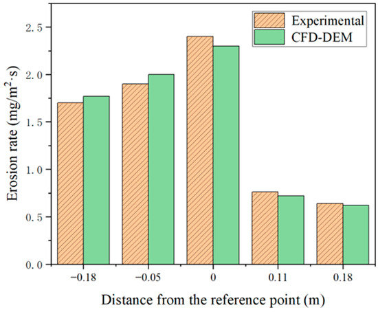 Verifying the computational accuracy of the model before the computation starts can help to improve the credibility of the model. In this paper, the physical and mathematical models of the vertical placement method were validated using the experimental results of valve erosion by H. Zhu et al. [39]. Figure 8 shows the control results of the experiment and simulation during the validation process, mainly by comparing the experimental measurements of the erosion rate of different positions of the valve with the simulated values.