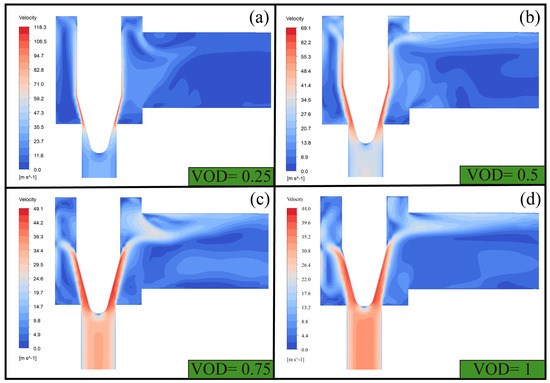 Maximum erosion rate of the spool at Different VODs (a) VOD = 0.25 (b) VOD = 0.5 (c) VOD = 0.75 (d) VOD = 1.