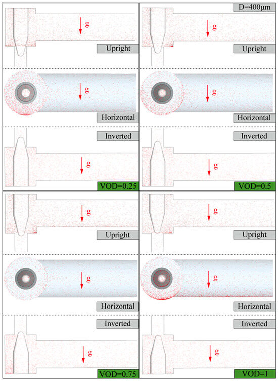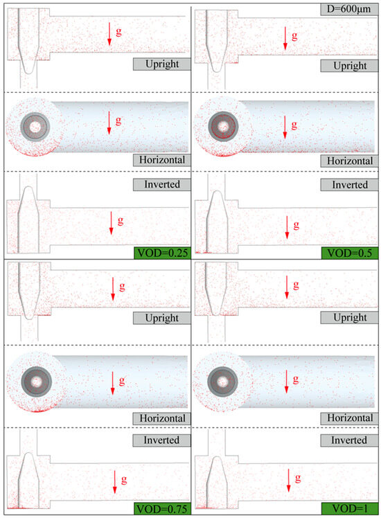 Figure 10 and Figure 11 show that in the inverted placement method, the deposition of particles is aggravated with the increase in particle diameter when using different VODs. When utilizing the horizontal placement method, the deposition of particles is greatly affected by both the VODs and particle diameters. In addition, the deposition of particles in the upstream pipeline in the horizontal placement method is not negligible compared to the other two placement methods.