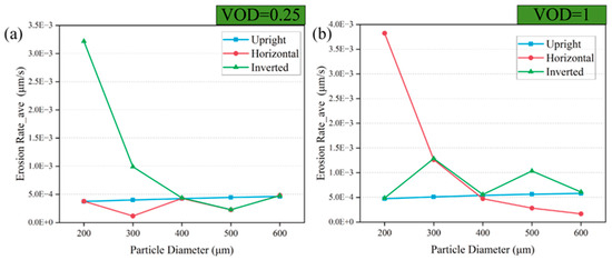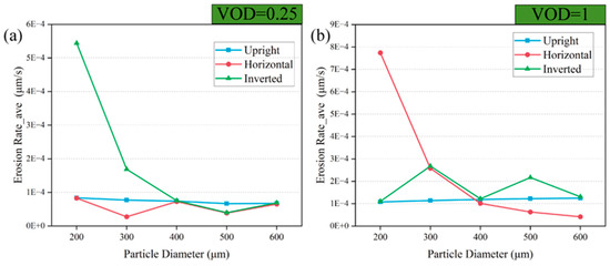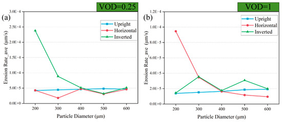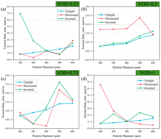 When the VOD is 0.75, the maximum erosion rate of the spool fluctuates greatly under horizontal and inverted placement modes. Specifically, the erosion rate of the spool is approximately in three placement modes when the particle diameter is 200 μm and 600 μm. As the particle diameter increases, the erosion rate of the spool in horizontal and inverted placement decreases first and then increases.