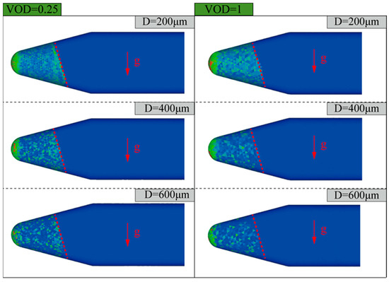 where is the velocity of the gas flow away from the obstacle; is the characteristic dimension of the obstacle or the characteristic length in the flow [29]; and is the relaxation time of the particles [30]. When the Stk. of the particle is smaller (Stk. ), it is easier for the particle to follow the streamlines of the gas flow and to achieve ‘perfect advection’, while when the particle diameter is larger, its Stk. is also larger (Stk. ), and inertia and gravity will dominate its trajectory more [31]. In the subsequent research, we will introduce particles of different sizes in the same case to explore the influence of collisions between particles of different sizes on the particle distribution.