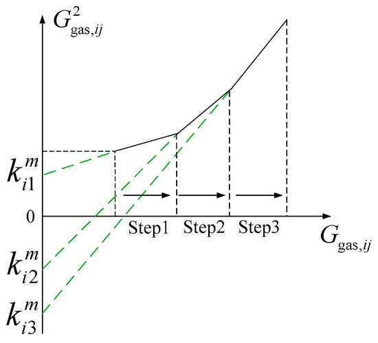 To simplify calculations, the quadratic terms of pressure and airflow are piecewise linearized. Introduce auxiliary variables = , = on the right side of Equation (1), replace Ggas,ij|Ggas,ij| on the left side of the equation with a piecewise function, set the positive direction of the airflow as i to j, and the value range of Ggas,ij is [0, ]. The negative direction is j to i, the value range of Ggas,ij is [−, 0], is the upper limit of flow transmission, and the piecewise linearization is shown in Figure 2.