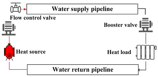 In heating networks, it is necessary to control the water pressure at both ends of the pipeline to ensure water flow. Therefore, devices such as flow control valves and booster pumps are added. Under the action of booster pumps, heating stations transfer thermal energy to heat loads through supply pipelines. After heat transfer, the water temperature decreases, and the water returns to the heating station through return pipelines, forming a heating cycle, as shown in Figure 3.