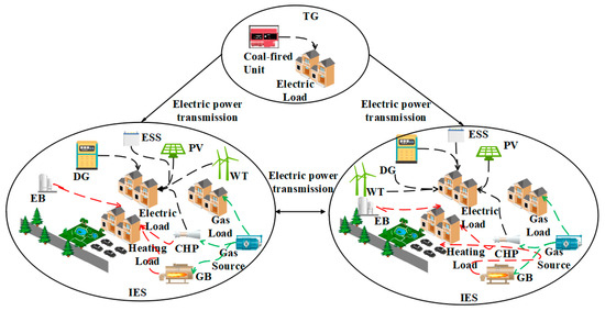 TG and IES achieve energy complementation between different levels through electric power interaction. Meanwhile, CHP (combined heating and power), GB (gas boiler), and EB (electric boiler) energy conversion units make coordinated decisions on the interactive power to achieve the coordinated dispatch of the TG-IES system. The energy flow in the system is shown in Figure 4, including the electric energy interaction between TG-IES and IES-IES, as well as the multi-energy conversion in IES.
