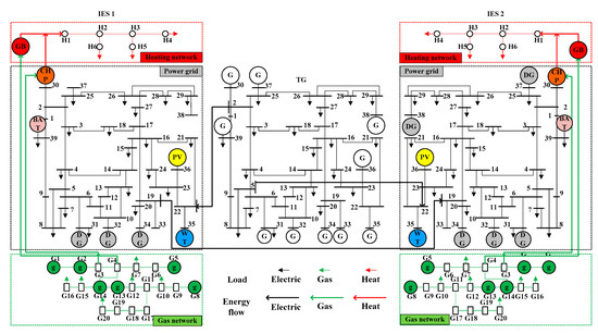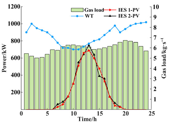 This paper selects the IEEE-39 node power system as the transmission network and the IEEE-39-20-6 node as the IES to construct the TG-IES1-IES2 system. Using MATLAB 2021b software to call the GUROBI solver for solving. The model parameters are shown in reference [25]. The carbon trading model and equipment parameters are shown in Table 1 and Table 2. The topology structure is shown in Figure 6. The predicted values of wind and solar, as known quantities, are shown in Figure 7. The predicted values of loads, as known quantities, are shown in Figure 8.