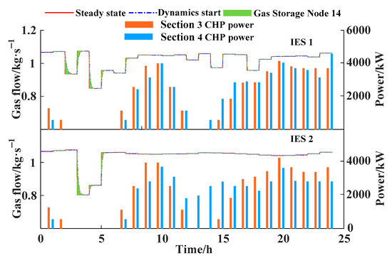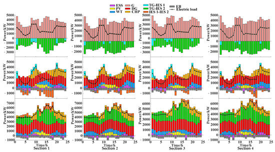 From Table 4, it can be seen that TG, IES1, and IES2 in Section 2 all have reduced costs compared to Section 1. The dynamic model reflects the storage characteristics of gas pipelines and the loss characteristics of thermal pipelines. During periods of high electricity consumption, utilizing stored gas fuel to supply energy to CHP can achieve peak shaving effects and reduce gas purchase costs. At the same time, to meet the energy demand of users under heat loss conditions, the cost of heat loss is reduced by reducing the thermal output of CHP units. At this period, CHP operates according to the working scenario of ordering power by heat, with a decrease in CHP power output and an increase in wind and solar power output, relieving the pressure on the TG power supply, reducing the grid costs of IES1 and IES2, and the total system cost.