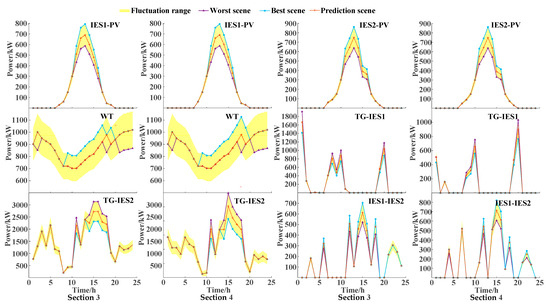 Section 3 and Section 4 present the scheduling results for predicted, optimal, and worst-case scenarios, with corresponding uncertainties shown in Figure 9. Compared to Section 3, during the 9:00–19:00 period when electricity consumption is high, the DG and CHP power output of IES1 and IES2 in Section 4 decreases, while the wind and photovoltaic power output increases. When the two-stage robust model is adopted, the scheduling result after adding the dynamic model is better than that of the steady-state model. The optimal period of wind power output and transmission power between subsystems in Section 4 is more than that in Section 3, and the wind power output and carbon yield in each section are also higher than those in other models. In summary, combining dynamic models with two-stage robust strategies can improve the power of new energy and reduce scheduling costs and carbon emissions.