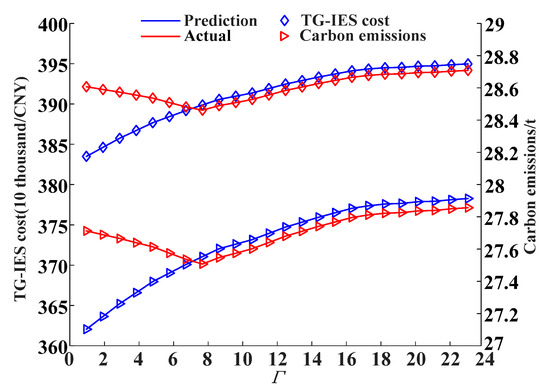 Figure 11 shows the variation curves of the total cost and carbon emissions concerning the uncertain adjustment parameter Г for both the predicted and actual systems in Mode 4. When the value of Г is less than 7, the total cost and carbon emissions gradually decrease because the number of adverse scenario periods increases, and it is necessary to ensure optimal scheduling in worst-case scenarios. The robust model plays a positive role. As the Г value increases, the duration of adverse scenarios exceeds the actual situation, resulting in a similar scheduling result between predicted and actual scenarios, showing an increasing trend. It is necessary to select an appropriate Г value based on historical data and actual engineering conditions.
