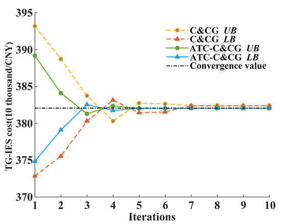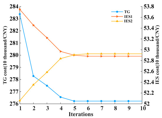This paper compares C&CG with ATC-C&CG to verify the effectiveness of ATC-C&CG in solving distributed robust models. The total cost iteration results are shown in Figure 12. After joining ATC, the transmission power is decoupled through Lagrange multipliers and penalty factors to achieve parallel computing of TG and IES. The costs of TG, IES1, and IES2 are balanced, and the cost iteration curve is shown in Figure 13. In the iterative calculation of ATC, C&CG jumps out of the loop after only one iteration, and the target value converges after five iterations. Using only C&CG to solve the model requires seven iterations, a longer computation time, and an additional cost of CNY 0.3365 thousand. Based on the above analysis, ATC-C&CG has improved the efficiency and accuracy of solving the model.