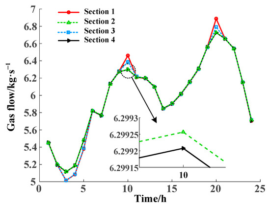The total amount of gas purchased by IES under different sections is shown in Figure 14. Compared with the comparison Section 1, Section 2, and Section 3, the gas source output of Section 4 decreased by 0.3046 km3, 0.0077 km3, and 0.1528 km3, respectively. Compared with Section 1 and Section 3, Section 2 and Section 4 have reduced gas purchases. Due to the lower energy demand from 3:00 to 5:00, the CHP output of IES1 and IES2 is 0. By utilizing the characteristics of pipeline storage, the remaining natural gas produced by the gas source is stored and used as fuel for CHP and GB from 7:00 to ~10:00 and from 17:00 to ~24:00, reducing the amount of gas purchased and thus reducing the cost of gas purchase, as shown in Figure 15. Compared to Section 3, Section 4 has reduced CHP output. The two-stage robust model can expand the solution space and solve for the optimal gas source output in the worst-case scenario, further reducing the gas purchase volume in Section 4.